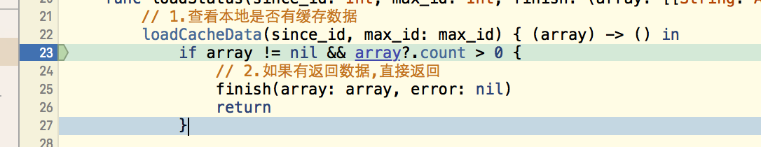 HMStatusDAL.swift中的loadStatus方法// 加载微博数据 func loadStatus(since_id: Int, max_id: Int, finish: @escaping ([[String: Any]]?, Error?) -> Void) { // 1.查看本地是否有缓存数据 loadCacheData(since_id: since_id, max_id: max_id) { (array) in // 2.如果本地有数据,直接返回给调用者 if let array = array, array.count > 0 { print("本地加载 \(array.count)") finish(array, nil) return } print("网络加载") // 3.如果没有缓存数据,去网络加载数据 // 判断accessToken是否为空 guard let access_token = HMUserAccountViewModel.shared.userAccount?.access_token else { // accessToken为空 return } // url let urlString = "2/statuses/home_timeline.json" // 参数 var parameters: [String: Any] = ["access_token": access_token] // , "count": 1 if since_id > 0 { parameters["since_id"] = since_id } else if max_id > 0 { // 别人传递了max_id.添加到字典里面 parameters["max_id"] = max_id - 1 } HMNetworkTool.shared.request(method: .GET, URLString: urlString, parameters: parameters, progress: nil, success: { (_, result) in // 获取返回数据中的微博数据 if let dict = result as? [String: Any], let array = dict["statuses"] as? [[String: Any]] { // 4.缓存网络加载的数据到本地数据库 self.saveStatus(array: array) // 5.返回数据给调用者 finish(array, nil) } }, failure: { (_, error) in // 5.返回数据给调用者 finish(nil, error) }) } }修改